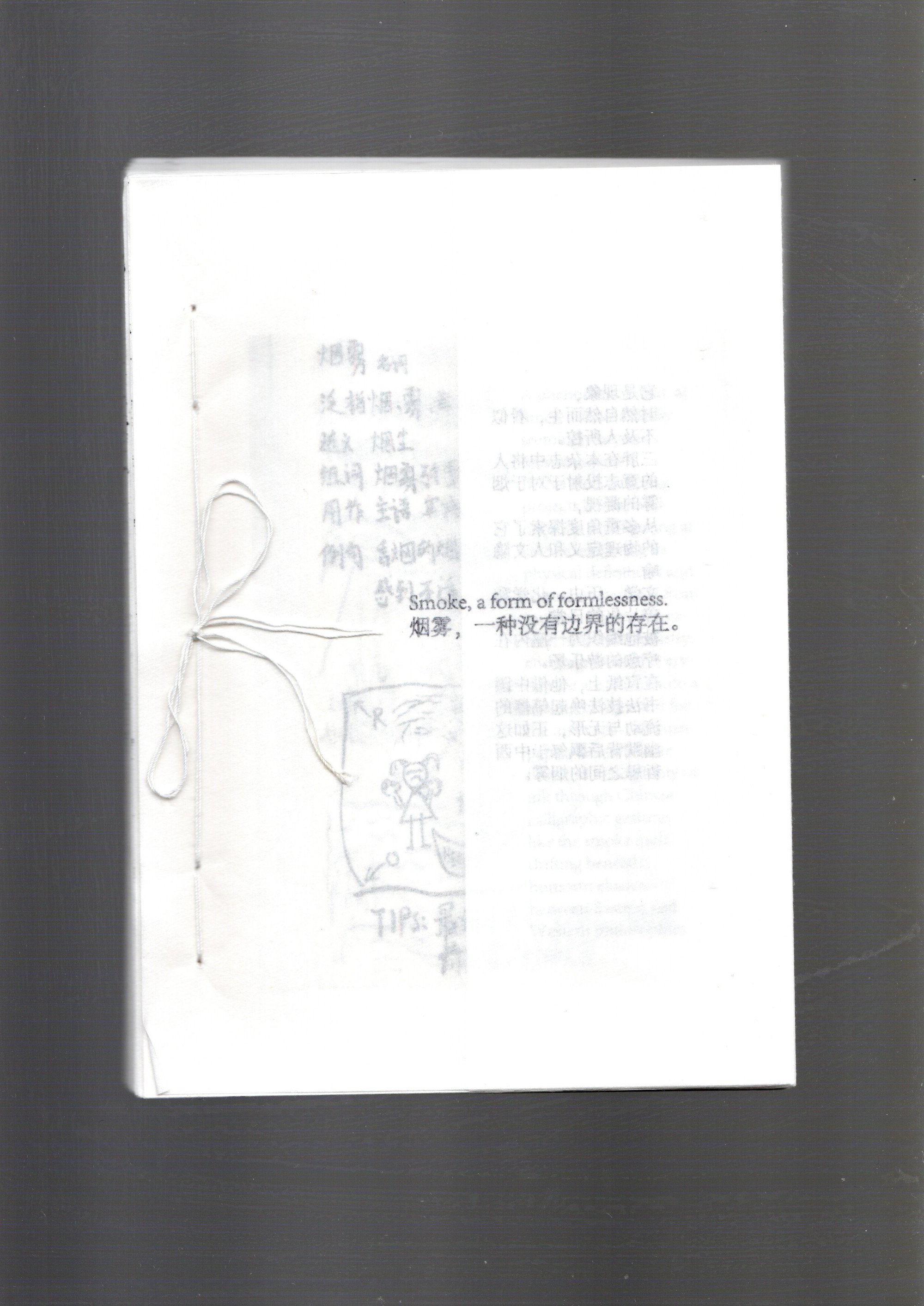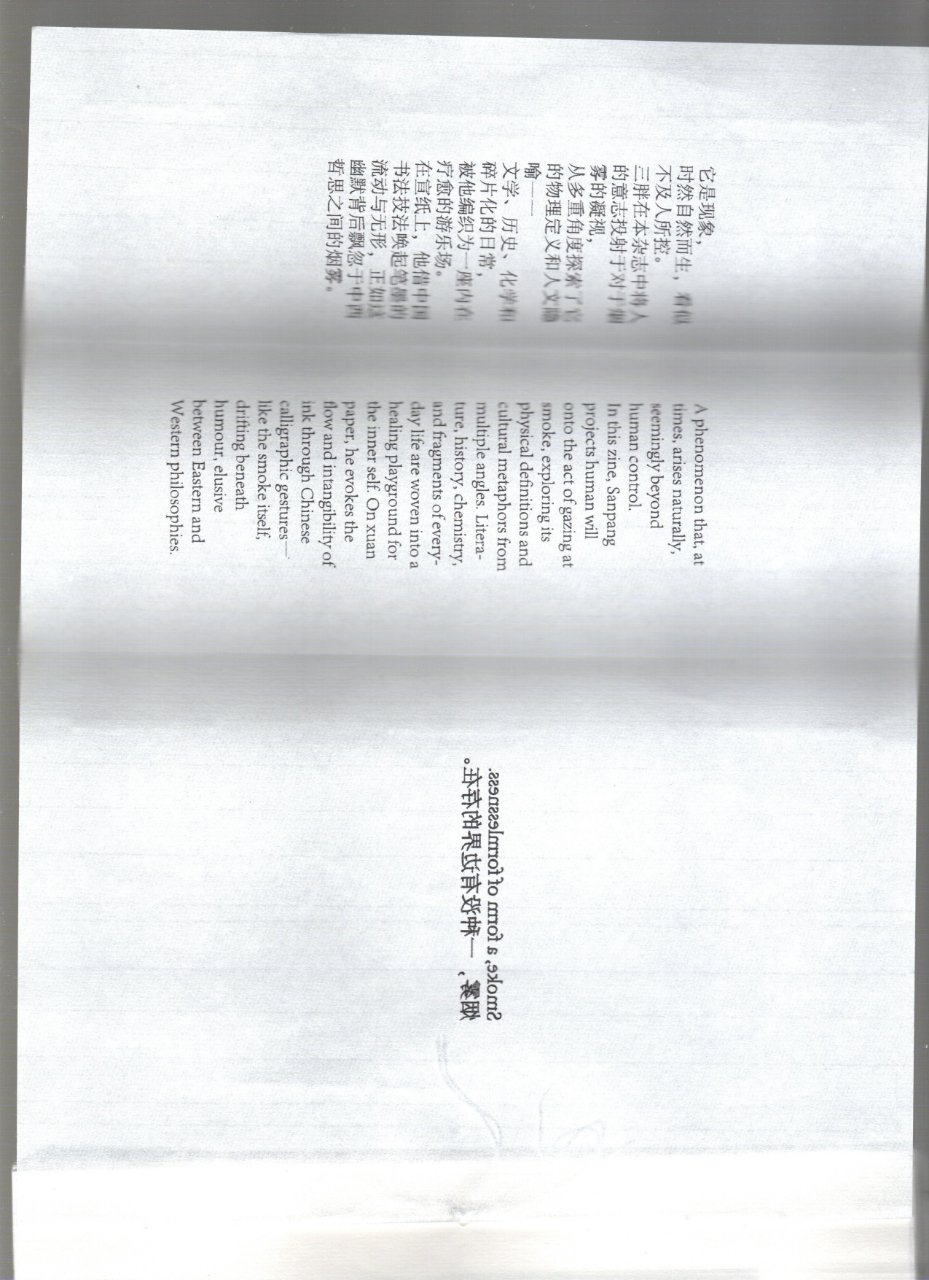 In this zine, Sanpang projects human will onto the act of gazing at smoke, exploring its physical definitions and cultural metaphors from multiple angles. Literature, history, chemistry, and fragments of everyday life are woven into a healing playground for the inner self. On xuan paper, he evokes the flow and intangibility of ink through Chinese calligraphic gestures— like the smoke itself, drifting beneath humour, elusive between Eastern and Western philosophies.